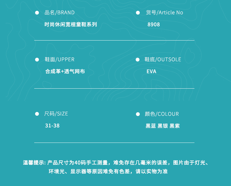 | 商品名称:悦足8908 新款舒适宽头儿童运动休闲运动31-38 |
