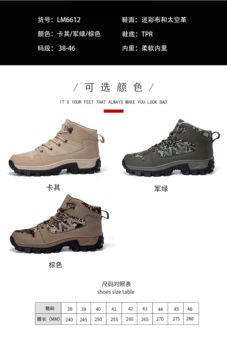 | 商品名称:跨境大码男士休闲户外登山鞋迷彩高帮男鞋LM6612 |