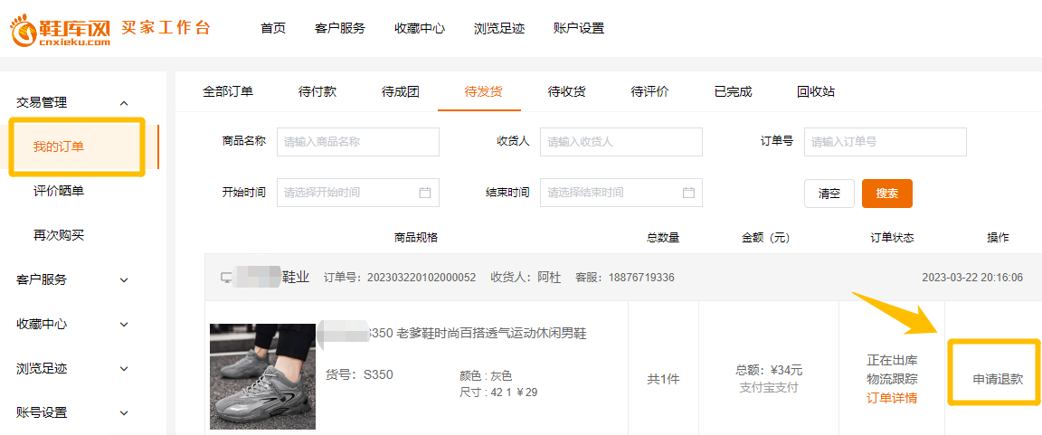 使用手机浏览器打开鞋库网首页http://www.cnxieku.com/,在网页底部,点击“个人中心” → 登录用户中心,点击进入“我的订单”,选择待发货的订单 → 点击“申请退款”按钮;