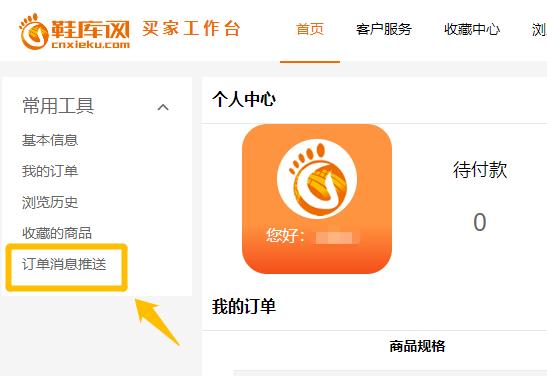 买家用户微信需要能接收鞋库网订单消息通知,首先该微信必须关注“鞋库网”微信公众号,然后登录买家工作台首页,微信扫描二维码绑定接收订单消息。